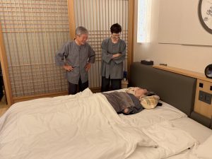 お部屋に入り、まずはベッドで一休み。とても広いお布団で寝心地も良さそうでした。家族と一通り会話を楽しんだ後には、お食事前の温泉入浴です。久しぶりの温泉はとても心地良いものだったようです。