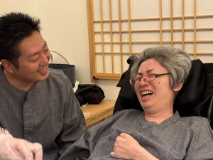 食卓に並べられた、美味しそうな食材に、患者様も嬉しそうです。今回もノンアルコールビールを味わっていただき、おいしい食事を次々に味わっていただきました。時折、涙を見せたり笑ったりなさる姿を見て、私たち付き添いスタッフも涙せずにはいられませんでした。ご家族の絆の素晴らしさを感じました。